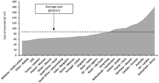 Cost of concrete (C30/37) in different countries excluding taxes (adapted from an international construction market survey in 2016 [1]).