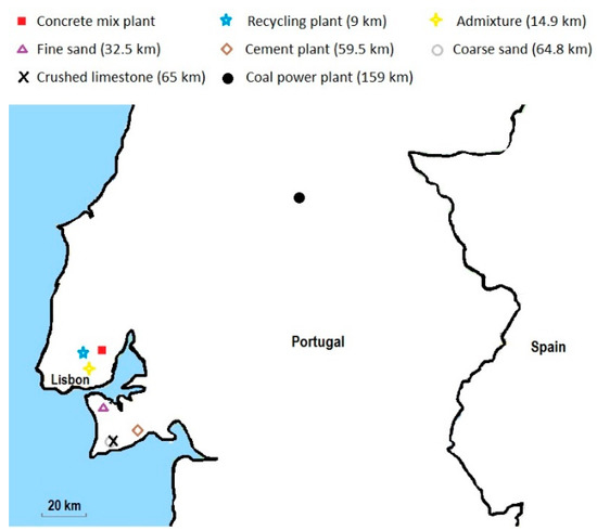 In this study, the most probable case scenario in the centre of Portugal was considered to estimate the transportation distances between the concrete mix plant and the suppliers of the materials (Figure 2). For that purpose, the selected database was obtained from a previous study [24], where the location of all the main suppliers of the raw materials and ready mix plants in Portugal was collected and documented.
