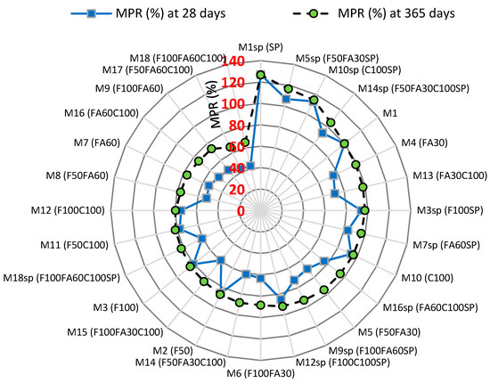 Mixes were optimized by comparing their MPR at longer ages (365 days) with their cost. The reason for which longer ages were considered is that at early ages, the full potential properties of the mixes containing FA widely differs from that of the mixes made with OPC only, due to the delayed hydration process of the former [36].