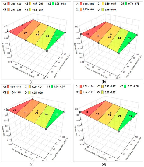 Concerning the effect of RCA on the mechanical and cost characteristics of concrete, the results show that mixes only with coarse RCA are all located in the suitable zone (M10 and M10sp in Figure 8). However, for fine RCA, it depends on its incorporation ratio in concrete. The incorporation of RCA can be considered as suitable up to 50% (M5 and M14 in Figure 8) (Figure 9b). Higher incorporation ratios of fine RCA are not so advisable, even if FA and SP are simultaneously incorporated in the mix.