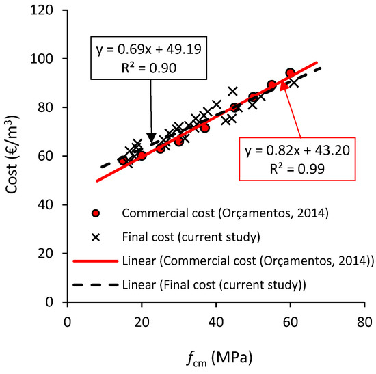 Figure 5 presents the relationship between compressive strength and cost of 1 m3 of concrete for the concrete mixes in this study (M1-M18sp) and commercial concrete mixes obtained from Portuguese suppliers [35]. There is a strong relationship between the two parameters with a determination coefficient of 0.90 and 0.99 for concrete mixes obtained by the current study and Portuguese suppliers.