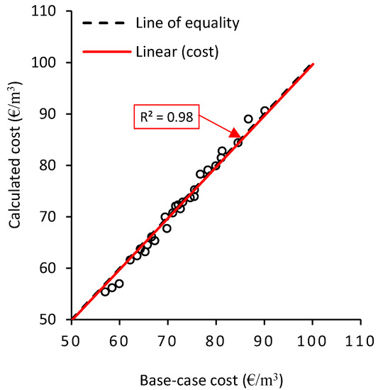 Generally, the price of raw materials depends on the region and supplier. Therefore, Equation (4) is proposed to compare the results of the reference concrete with those of the other mixes made with various incorporation ratios of FA and RCA, with or without SP, even if the price of these raw materials changes. As seen in Figure 6, the results can be represented by the line of equality with a high coefficient of determination (R2 = 0.98).