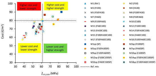 Figure 7 shows the importance of considering the cost and compressive strength simultaneously to select concrete mixes based on the target application. The cost and compressive strength of the concrete mixes with conventional concrete (M1) are compared. For example, M13 presents a similar strength value but a lower cost than that of conventional concrete. On the contrary, M5sp has a similar cost but a higher strength. Finally, the selection of one of the others concrete mixes depends on the selected application. For example, the mixes located in “lower cost and lower strength” zone are preferable for residential houses, and the mixes located in “higher cost and higher strength” zone for high-rise buildings. However, to select suitable mixes within each of these sub-groups, it is important to make a more comprehensive cost efficiency optimisation considering cost and MPR, such as proposed in Section 3.3.