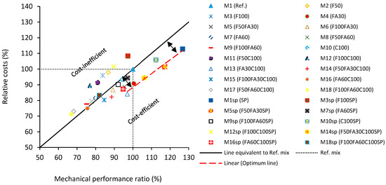 In Figure 8, the optimum mixes were selected based on their distance from the “line equivalent to the reference mix” in the cost-efficient zone, since this distance is proportional to their cost-efficiency. In other words, compared to that line, the optimum mixes were those with higher MPR-to cost-ratio (e.g., equivalent costs and superior mechanical behaviour, or equivalent mechanical behaviour but lower cost). For example, from the cost-efficient concrete mixes, the following ones can be considered as optimum: M1sp, M5sp, M14sp, M4 and M13, which were mostly made by incorporating FA, RCA, and SP simultaneously. Furthermore, it is possible to consider M14sp (100% coarse RCA, 50% fine RCA, 30% FA, 1% SP) as the best mix among the optimum mixes, because its strength is higher than that of the reference mix (M1) and its cost is lower. In addition, M4 (30% FA) is considered to be the second-best due the same reason. These results agree with the literature (Section 1) that shows that it is wrong to optimize concrete mixes based on their strength (Figure 3) or cost (Figure 4) individually.