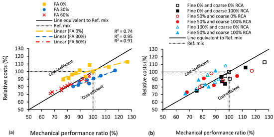 Relationship between relative cost and mechanical performances ratio of mixes classified based on the incorporation ratio of (a) FA (regardless of the type and ratio of the aggregates) and (b) RCA (regardless of the type and ratio of the binders).