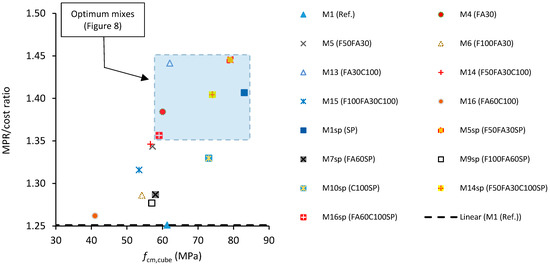 In order to confirm these findings, this study presents a relationship between the “MPR-to-cost ratio” and the compressive strength (fcm,cube) of the concrete mixes (Figure 10). The compressive strength (x-axis) is considered because it is the most demanded characteristic of concrete in the construction industry. Since the optimization of concrete depends on its application, this chart can be useful when a minimum compressive strength is considered to select the optimum mix. For example, high-strength concrete may not be required for residential houses. As concluded before, the following mixes (M1sp, M5sp, M14sp, M4 and M13) can be considered as optimum because their “MPR-to-cost ratio” values is higher compared to other mixes. Again, apart from the fact that the SP increases the cost of concrete, most of the mixes made with SP are above the reference line and are therefore more cost-efficient than M1 (M1sp, M5sp, M7sp, M9sp, M10sp, M14sp and M16sp). Thus, the use of SP is highly cost-efficient. In other words, mixes with high-strength are more cost-efficient than low-strength concrete. In that case, it is worth paying more to increase the strength of concrete, since this investment has a higher return. In addition, the cost efficiency of the coarse RCA concrete is significantly higher than that of the fine RCA concrete (e.g., M13 versus M6; M16sp versus M16sp). Furthermore, concrete with an incorporation of FA can be considered as cost-efficient, and the high incorporation of FA are even more cost-efficient when SP used.