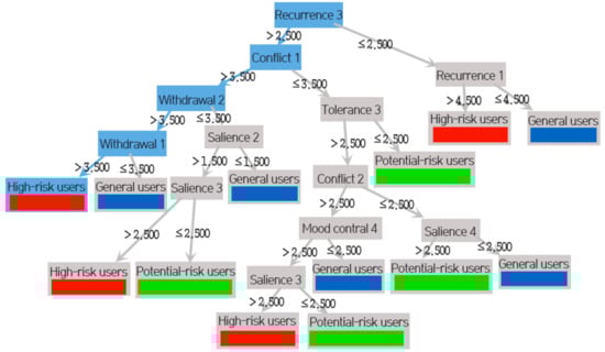 The decision tree is analyzed as follows. Overall, “recurrence 3” had the greatest impact on high-risk users. Among the 24 items of the questionnaire, it can be seen that items “recurrence 3,” “conflict 1,” “withdrawal 2,” “withdrawal 1,” and “recurrence 1” have an influence on the high-risk user group. Furthermore, items affecting the potential-risk user group are “salience 3,” “salience 4,” and “tolerance 3.” Therefore, we propose that we weight all items according to the items rather than 1 to 5 points equally.