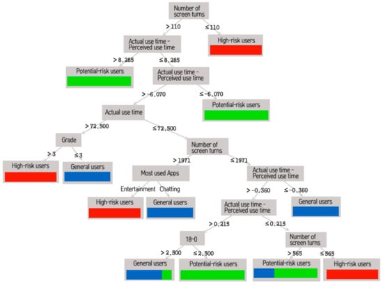 The decision for the individuals to be grouped in the high-risk user group was made based on the following points. First, the screen is turned on for more than 110 times per day. Second, users spent more than 6.07 h and less than 8.29 h per day, while they spent more than 72.5 h per week using their smartphone. In particular, the third-grade students are smartphone-addicted, for whom, the results show that their phone screen was turned on more than 1971 times and most of their time is spent on entertainment applications. For the risk group, the usage time was less than 0.215 h and the number of the times the screen was turned on was less than 565 times; therefore, The input variables that have the greatest influence on the high-risk user group are the “number of screen turns” and the “actual use time—use time” variable. These results are shown in