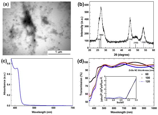 (a) Transmission electron microscope (TEM) image of ZnSe nanocrystal (NC); (b) X-ray diffraction (XRD) pattern of the ZnSe NC (nanocrystal) thin film; (c) absorbance of ZnSe NCs in toluene; and (d) transmission spectrum of the ZnSe NC thin film with different thicknesses (ITO/ZnO/ZnSe, inset shows the plot of bandgap).