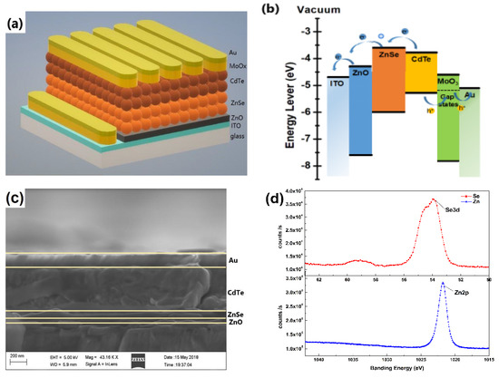 The architecture and band alignment of the NC device are presented in Figure 2a,b. In this device structure, carriers are mainly generated in the CdTe NC active layer. Unlike CdS or CdSe, the conduction band of ZnSe is higher than that of CdTe, a type I heterojunction is formed for CdTe/ZnSe heterojunction, and therefore band bending at the ZnSe interface is spike like. It is noted that the hole barrier levels for CdTe/ZnSe heterojunction depends on both the valence band levels and the Fermi levels of the CdTe and ZnSe. A small positive conduction-band offset may help maintain good cell efficiency as it created a large hole barrier adjacent to the interface and reduced interface recombination [32,33,34]. Efficiency up to 11% has been attained in the case of Cu(In,Ga)Se2 thin-film solar cells with ZnSe buffer layer [35] while >21% efficiency has been achieved for the ZnS buffer layer [36]. Therefore, CdTe NC solar cells with a ZnSe NC buffer layer is expected to obtain efficiency once the CdTe/ZnSe junction quality is improved. The MoOx buffer layer blocks electrons and facilitates hole collecting, which was confirmed in the previous report [27]. The cross-sectional SEM image of ITO/ZnO/ZnSe/CdTe/MoOx/Au is presented in Figure 2c. It is clear that the CdTe NC and ZnSe NC layers are compact and pin-hole free. The X-ray photoelectron narrow scan (XPS) of Zn 2p and Se 3d spectra levels are presented in Figure 2d, which implies the formation of the ZnSe composite. The thickness of the ZnSe NC buffer layer and the annealing temperature have great impact on the performance of NC solar cells, as shown in Figure 2e, f. To compare device performance with different thicknesses of ZnSe NC, all the samples are prepared at the same conditions and annealed at 350 °C with CdCl2 treatment after five layers of CdTe NC are deposited. We found that the Jsc increases from 3.58 mA/cm2 to 10.35 mA/cm2 when ZnSe thickness increases from 25 nm to 110 nm and decreases to 5.61 mA/cm2 at 125 nm, which is significantly lower than the thickness among CdTe/CdSe or CdTe/CdS NC solar cells [10,19]. By contrast, the thickness of the ZnSe NC buffer layer has significant effects on the Voc, FF (fill factor), and PCE of NC solar cells. The efficiency of the NC device is increased from 0.38% to 1.93% when the thickness of ZnSe is increased from 25 nm to 110 nm. In addition, PCE decreases when ZnSe is thicker than 110 nm.
