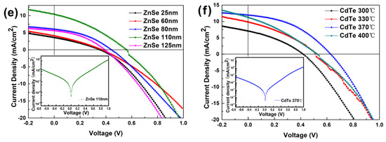 (a) Schematic and (b) energy band alignment of CdTe NC solar cells with the ZnSe NC buffer layer; (c) cross-sectional scanning electron microscope (SEM) image and (d) X-ray photoelectron narrow scan (XPS) of NC solar cells. J-V curves of CdTe NC solar cells (e) with different ZnSe NC thicknesses and (f) with different annealing temperatures (inset of Figure 2e,f show the J-V curve expressed in logarithmic coordinates.).