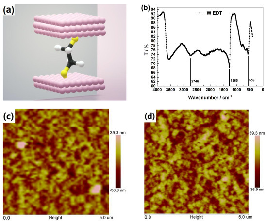 (a) A schematic figure of 1,2-ethanedithiol (EDT) bonding to adjacent ZnSe NC film; (b) Infrared spectrum of EDT treated ZnSe NC thin film, atomic force microscopy (AFM) images of ZnSe NC thin film (c) without EDT treatment (d) with EDT treatment.