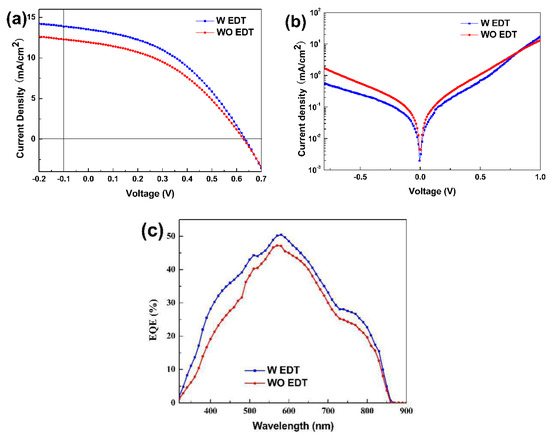 J-V curves of CdTe NC solar cells without EDT treated ZnSe NC film (a) under light and (b) dark; (c) external quantum efficiency (EQE) spectrum.