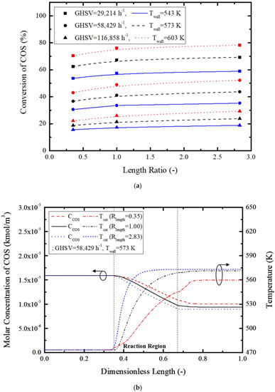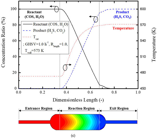 Figure 7b shows the effect of the length ratio on the COS concentration inside of the reactor and temperature; the COS concentration rapidly decreased with the length ratio, while temperature increased proportionally. This is attributed to facile heat transfer and radial gas diffusion in the tube via reduction in the reactor diameter and an increased tube length, respectively, causing an increased reaction rate. Therefore, an optimized length ratio could result in a higher COS conversion rate.