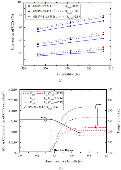 Figure 8a shows variation of the conversion rate with temperature on the reactor wall (547–603 K), showing a maximum 19.3% increase in the COS conversion rate for the same GHSV and length ratio.