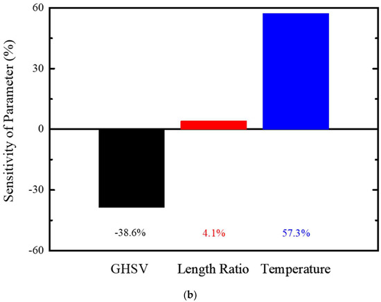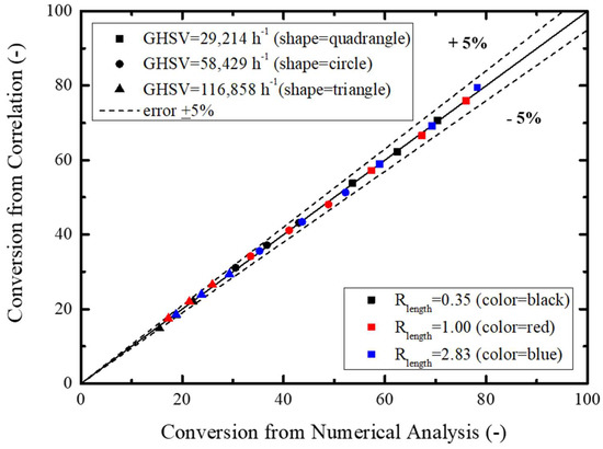 In view of the previously performed numerical modeling analysis results, regression analysis was made incorporating GHSV, length ratio, temperature, and conversion rate: Equations (15)–(18).