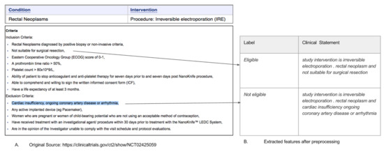 The original data were exploited by merging eligibility criteria together with the study condition and intervention, and subsequently transforming them into lists of short labeled clinical statements that consisted of two extracted features (see example in Figure 2), the label (Eligible or Not Eligible), and the processed text that included the original eligibility criterion merged with the study interventions and the study conditions. These processes are detailed in the following section.