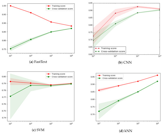 Learning curves with 5-fold cross-validation on the FastText, Convolutional Neural Network (CNN), Support Vector Machine (SVM), and k-Nearest Neighbors (kNN) classifiers. Horizontal axes show the total training samples, whereas vertical axes are the -score. The green region represents the standard deviation of the models.