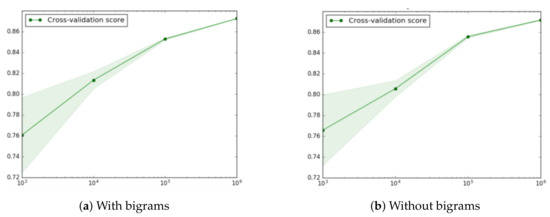 The learning curve (Figure 4) shows the evolution of the during training when the number of training samples was increased from 800 to 800K. The curve converged with the score obtained in the training sample to a maximum of 0.88 when using the full dataset, as shown in Table 3. The validation score converges with the training score, and the estimator does not benefit much from more training data, denoting a bias error. It has been reported that the phenomenon of not being able to increase the performance with additional data can be overcome with the use of deep learning models applied to complex problems, in contrast to a fast but thin architecture such as FastText (as will be proved later when using CNNs). On the contrary, the model did not suffer from a variance error. Cross-validation was used to assess how well the results of the model generalized to unseen datasets and obtained robust average validation results with a decreasing standard deviation over the k folds (Figure 3a).
