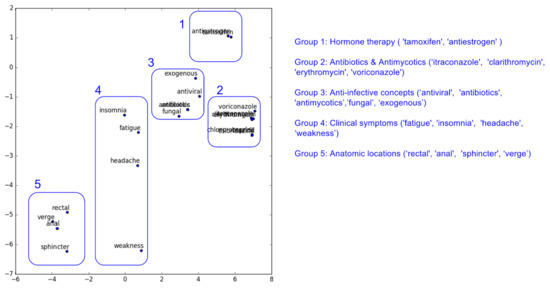 We defined those words from the complete corpus that we wished to analyze (as it is not possible to visualize all 26,893 words), and obtained the vectors of these words. The t-SNE representation in Figure 5 shows two aspects: on the one hand, the words are grouped by semantic similarities, and on the other, the clusters seem to follow a spatial distribution in different regions in a diagonal direction from intrinsic/internal to extrinsic/external concepts with respect to the human body: [G5] body organs → [G4] body symptoms → [G3] infections, cancer and other diseases → [G1,G2] treatments.