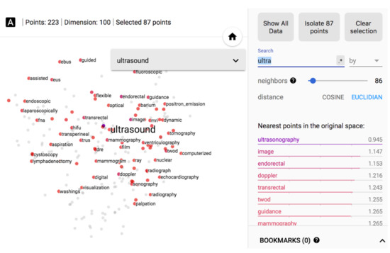 Figure 6 shows an example of these results when using the word “ultrasound” as a query. We can appreciate that the 87 nearest points to ultrasound were all related to explorations, and mainly medical imaging. The nearest neighbor distances are also consistent when using other concepts. For example, Table 6 shows that the model successfully extracted hormonal therapies from breast cancer as the t-SNE nearest neighbors to “Tamoxifen”.