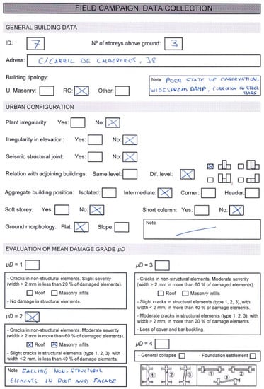 The template consisted of three sections covering: (i) general data, such as the building description or the address; (ii) the constructive topics and urbanistic conformation of the building, such as the presence of short columns or soft storeys; and (iii) the evaluation of EMS-98 damage degree . In the second phase of the work, the collected data was completed with the cadastral information required to implement the remaining modifiers of behavior in the RISK-UE LM1 methodology, such as the year of construction, comparing also the modifiers obtained in the field campaign, such as the number of storeys above ground or the aggregate building position. Nevertheless, for applying the proposal on a large scale in further studies it is highly recommended to use the cadastral database to allow for a more standardized implementation of the methodology.