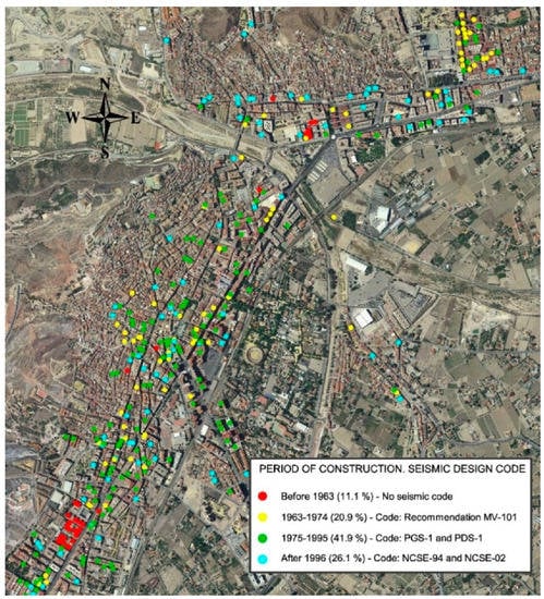 In both cases, in spite of the damage distribution not being homogeneous, the modeled results reflect that the most vulnerable areas to a certain seismic action were mainly concentrated in the northeast neighborhoods and the central and southwestern areas of the city, as has been presented in some studies [27,40]. Precisely, these zones suffered widespread damages in buildings after the 11 May 2011 earthquake, even with the collapse of one entirely residential building [5,6].