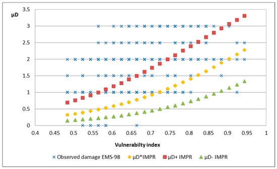 Thus, the damage grade estimated according to the proposed model of the LM1 method for an earthquake of IEMS-98 = VII has been compared with the corresponding damage observed in the 2011 Lorca earthquake. Figure 4 shows the distribution of both values obtained from the input collection data. For each building, the estimated mean damage grade * is plotted with its corresponding vulnerability index Ivb along with the possible range [−, +] associated with the interval [Iv−, Iv+] defined in BTM. Moreover, the observed EMS-98 damage , plotted as a cross mark, is shown with the same Ivb values. As can be observed, for an earthquake of IEMS-98 = VII the damage simulated by the proposed LM1 method remains below the levels of actual observed damage.