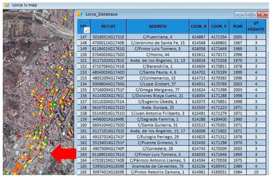 In order to apply the improved method proposed in this contribution, the Department of Civil Engineering of the Technical University of Cartagena carried out a field study to register all the seismic behavior in reinforced concrete buildings affected by the Lorca earthquake that occurred in 2011. Despite having a moderate magnitude of 5.1 Mw, the quake on 11 May 2011 caused important casualties (9 people died and more than 300 were injured) and important structural damage which forced more than 10,000 people to be evacuated from their homes during the first days [36]. Considering the comparatively small size of the city of Lorca and the homogenous results that the seismic event produced in the urban area, the quake was defined with an EMS-98 macroseismic intensity (IEMS-98) of VII [37] in the main neighborhoods of the city.