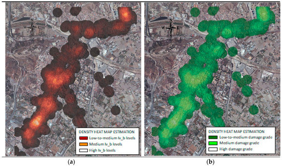 Thus, the geospatial dissemination of the vulnerability indexes of RC buildings studied in Lorca, obtained according to the improved LM1 method proposed in this work, is described in Figure 6a by means of a density heat map estimation. Similarly, the distribution of expected damage grade obtained according the proposed model for an IEMS-98 = VII earthquake can be observed in Figure 6b.