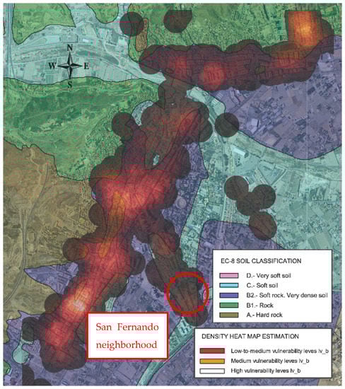 GIS plotting of density estimation for the vulnerability indexes Ivb of RC buildings analyzed in Lorca, obtained according to the proposed LM1 method, overlapped with the EC-8 soil types identified in the microzonation study of Lorca. The location of the San Fernando neighborhood is highlighted.
