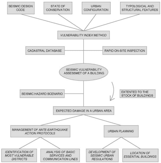Moreover, macroseismic—or empirical—methods allow for the performance of a specific building to be characterized based on a statistical analysis of observed damage during past earthquakes. From a series of characteristics related to the typology and the structural design of each building, these models estimate the seismic susceptibility according to vulnerability classes, through descriptors or qualitative variables [12,13], or according to vulnerability indexes by means of a numerical valuation as a result of the quantification of the above-mentioned parameters. These methods include the Italian Method [14], the Japan Method [15], NZSEE and US Guidelines [16,17], the Vulnerability Index Method [18], or recent European Commission reports [19].