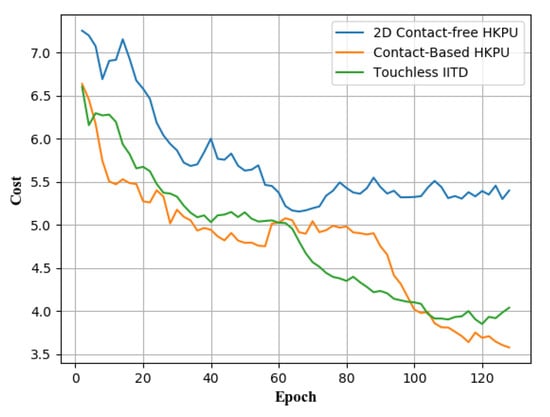 To extract palmprint ROI features, we passed palmprint ROI images, obtained by REM, through the network and optimized the final vector of feature matrix, where n is the overall number of images in each database. In other words, the values of each row in this vector correspond to the features of each individual’s image. For example, considering for the contact-based HKPU database, the first 18 images of overall 3480 images are related to the first person, the second batch of 18 images is for the second person, and so on. A learning rate of was fixed for the FEM network. The cost function of the fine-tuning process in FEM is depicted for three databases in Figure 11.
