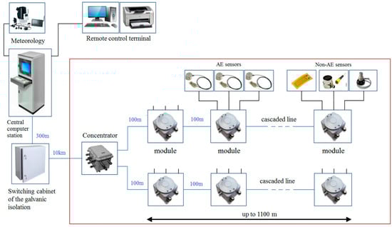 Multifunctional data acquisition and transmission module is the main element of this architecture and is a separate device in an explosion-proof enclosure with installed cable entries. Each module contains several measuring units that collect data from external sensors of various types, and, if necessary, supply power to them. In particular, analogue filtering, digitization and digital filtering of signals, as well as calculation of AE parameters (such as arrival time, amplitude, duration, etc.) and the registration of waveforms are performed in a measuring unit intended for operation with an AE sensor. The total number of sensors connected to the module can be up to 6. In addition, module includes a digital processing unit, communication unit and power unit. Multifunctional data acquisition and transmission modules are connected in series with each other by a cable that provides power and relay the data through the cascaded line. The modules are placed, as a rule, near the sensors, which together with digital data transmission, achieve high interference immunity.