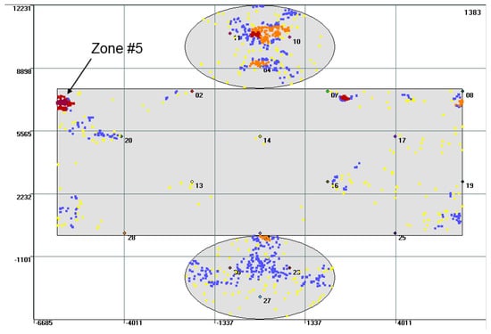 In total, about 500,000 AE signals were analyzed, including 65,000 waveforms. For AE signals registered by the channels testing zone #5, 23 clusters were formed. While conducting cluster analysis, 14 clusters was attributed to process-induced AE events, 4 clusters corresponded to the correlated noise and 5 clusters were characterized as the sources of AE with high probability.