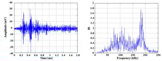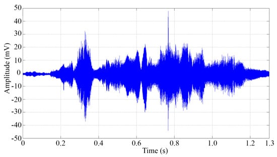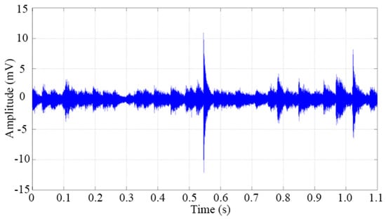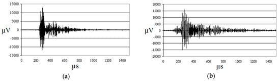 The AE signal, characteristic for the friction process, is a continuous random process characterized by a distribution of pulse amplitudes close to normal, which is not typical for cracks. It is found that higher RMS amplitudes of the acoustic signal are observed in roller bearings with a long service life, which allows us to conclude that the RMS amplitude of the AE signal characterizes the integral degree of wear of the shaft surface []. Figure 22 shows the signals obtained in the diagnosis of roller shafts that were in service for 2 and 9 years. The corresponding RMS amplitudes are 0.9 mV and 2.2 mV.