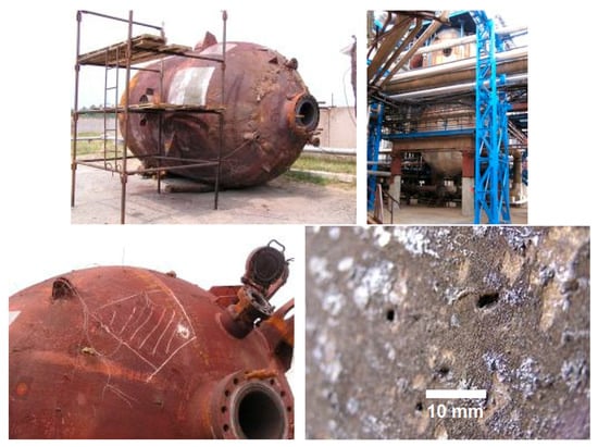 Thus, the results of the cluster analysis confirmed a previously determined degree of danger of AE source located in zone #5. A final decision to stop the hydrotreater was made. The dismantled hydrotreater was investigated by NDT in order to establish the reasons of its transition to the critical state. Internal examination revealed numerous disintegrations of the cladding layer (up to its complete absence in some areas) (Figure 4). Dimensions of damages were up to 5 mm. Ultrasonic testing revealed numerous discontinuities in welds and the base metal shell. The lengths of discontinuities were 100 mm along and 15 mm in depth. In one of the most active zones, discontinuities were detected both in welds and in the heat-affected zone. Certain discontinuities occurred at different depths, from 26 to 80 mm. These damages demonstrated significant degradation with loss of mechanical properties of the metal, which leads to brittle fracture of the structure [].