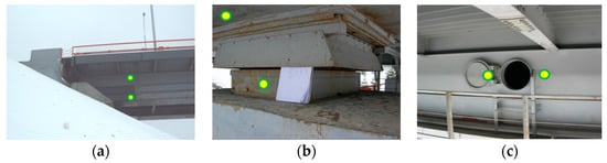 Zone I: In the area of the expansion joint near the shore support (Figure 5a), sensors were installed inside the beam structure near the bolted joints. The distance between the sensor and the expansion joint is 5 m. Zone II: In the area of attachment of the beam and the support (Figure 5b), AE sensors were installed on the lower girder and on the support. Zone III: In area of the exit hatch section of the box beam (Figure 5c), AE sensors were installed inside the beam structure at a distance of 3 m from each other symmetrically with respect to the hatch.