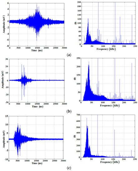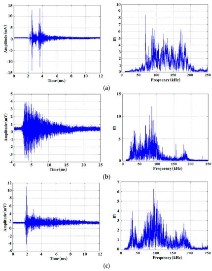 AE signals caused by impacts of structural elements: (a) Zone I; (b) Zone II; (c) Zone III.