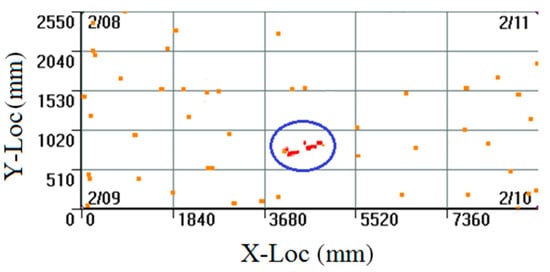 For detection of signals from the Hsu-Nielsen source, a planar location was constructed (Figure 9). It is revealed that the signals from Hsu-Nielsen source are with certainty located in their actual places and form compact clusters, in contrast to noise. This confirms the possibility of identifying signals from defects based on location data.