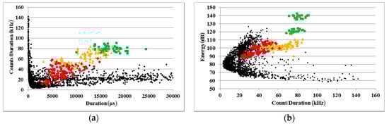 (a) Scatter plot diagram of AE signal energy and duration; (b) scatter plot diagram of amplitude and parameter “counts/duration.” Impulses corresponding to noise are marked black, while impulses from the Hsu-Nielsen source emitted at distances of 0–2 m, 2–7 m and 7–15 m from AE sensors are marked green, yellow and red, respectively.