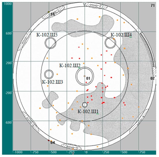 Prior to installation of the monitoring system during the overhaul in the spring of 2012, its AE testing was carried out (Figure 12 and Figure 13). AE sources of class I and II were registered, the locations of which were correlated with the place of previously detected defects on the vessel head of the adsorber (Figure 12). This allowed us to assume the possibility of further expansion of the lamination zone during the life extension period of the adsorber.