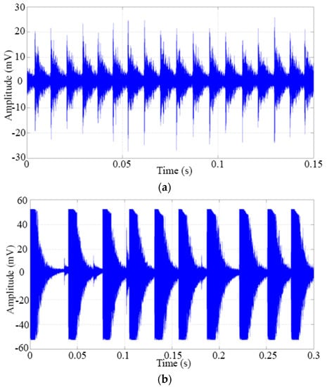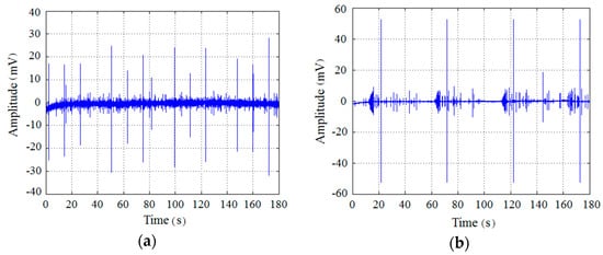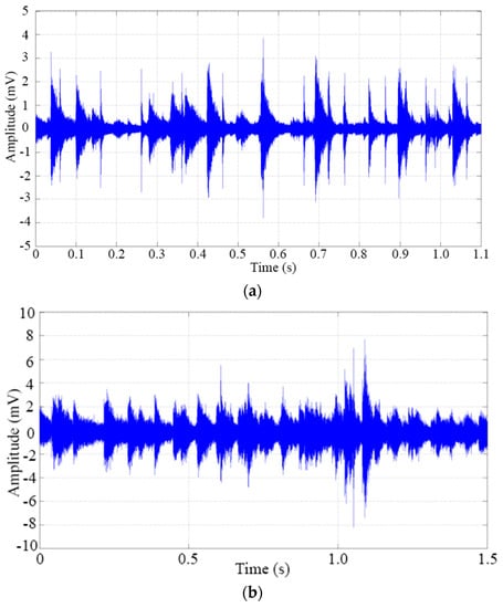 AE signals obtained during the diagnostics of shafts of roller bearings being in operation for (a) 2 and (b) 9 years. The corresponding RMS amplitudes are 0.9 mV and 2.2 mV.