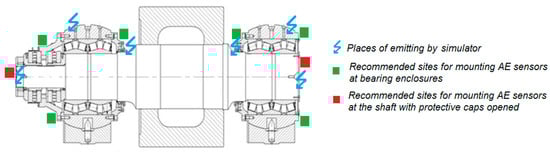 Scheme of the roller bearing with the protective caps removed. The points of emitting by simulator and the recommended positions for the sensors mounting.