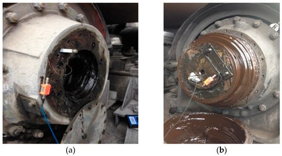Sensors mounted at bearing housing (a) and at the end of the roller bearing (b) with the protective caps removed.