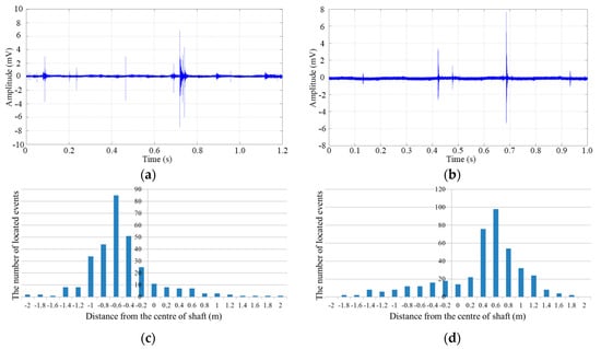 Waveforms of AE signals recorded on shafts of 2 roller bearings (a,b) and linear location results (c,d).