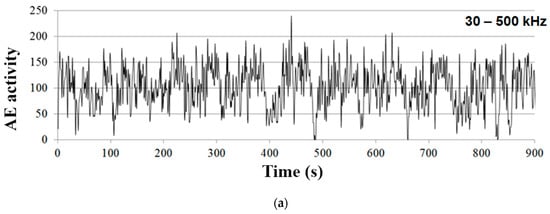 At the first stage, the frequency range and threshold were selected and the acoustic properties of the monitored object were determined. Two frequency ranges were tested: 30–500 and 150–500 kHz. When using a wide frequency range (30–500 kHz), an extremely high AE activity was observed, which did not have a visible dependence on the operating mode of the dragline excavator, that is, on the value of the load. Such noise is associated with the continuous operation of the equipment (working winch, loose structural elements, engine operation, vibration, etc.).