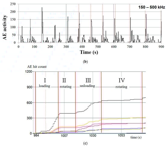 AE activity when using 30–500 kHz (a) and 150–500 kHz (b) frequency filters. Correlation of AE hit count with the cycle of operation of the dragline excavator when using 150–500 kHz frequency range (c).