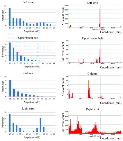 At the second stage, within 2 days, the AE data was collected directly for subsequent detailed analysis. The distribution of the AE signal amplitudes was analyzed. For all structural elements except for the struts, the differential distribution of the amplitudes was exponential, that is corresponding to a random noise process. On the left and right struts in the range of amplitude values of 80–85 dBAE, the distribution was significantly different from the exponential, which indirectly indicated the presence of a defect.