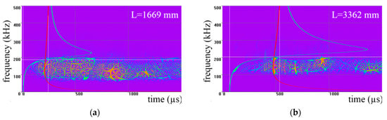 In addition, the spectrograms of the signals on the struts were analyzed, which made it possible to determine the arrival times of different frequency components (Figure 28). It was confirmed that the signals were emitted by impulsive sources and propagated along the walls of the object as Lamb waves. With the help of the spectrogram analysis, the distances between the AE sources and AE sensors were obtained, which coincided with the results of the usual linear location based on the analysis of the arrival times difference [,].